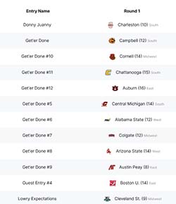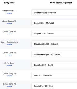 - Each entry is randomly assigned one NCAA team from the first round (a maximum of 64 entries are allowed).